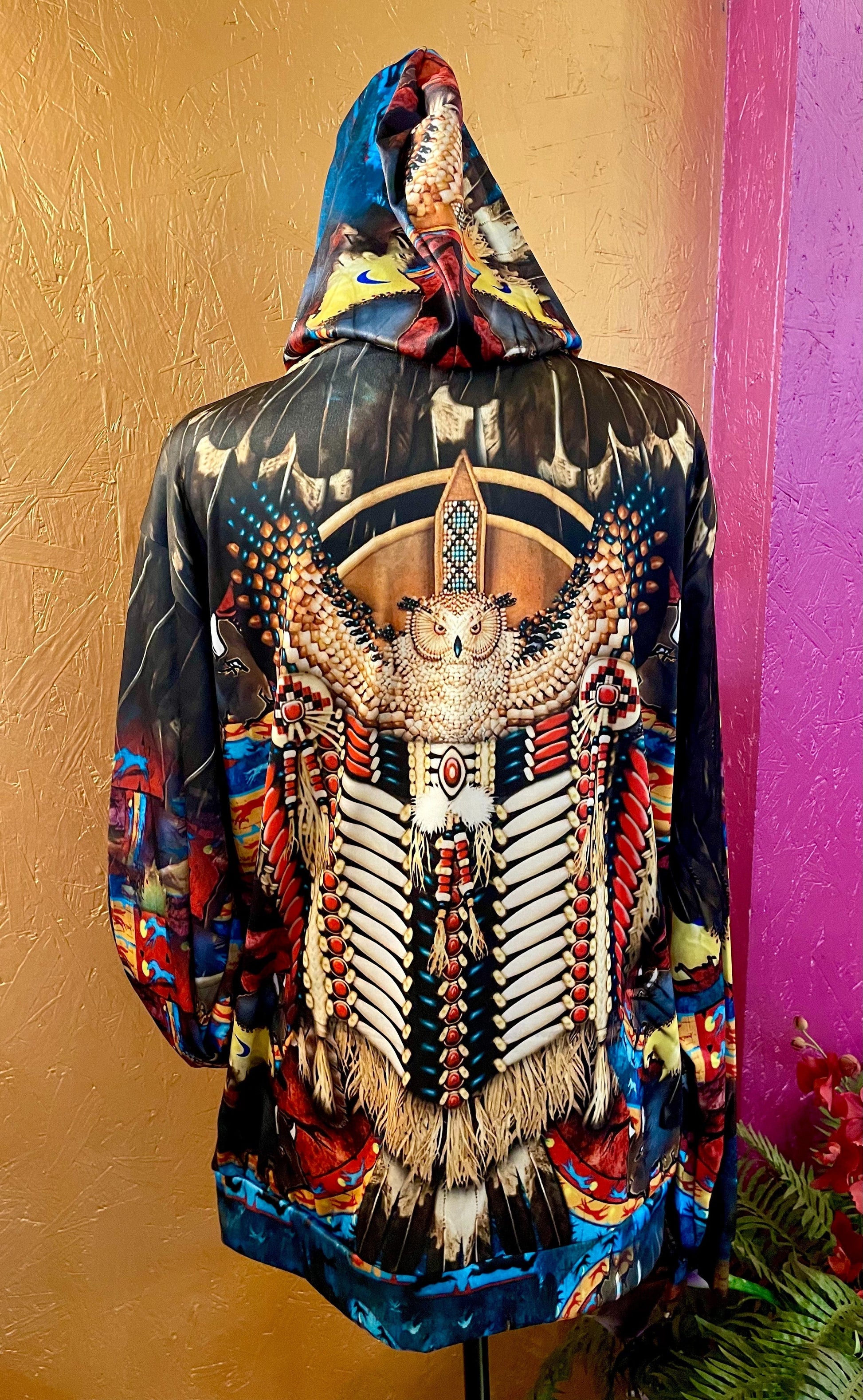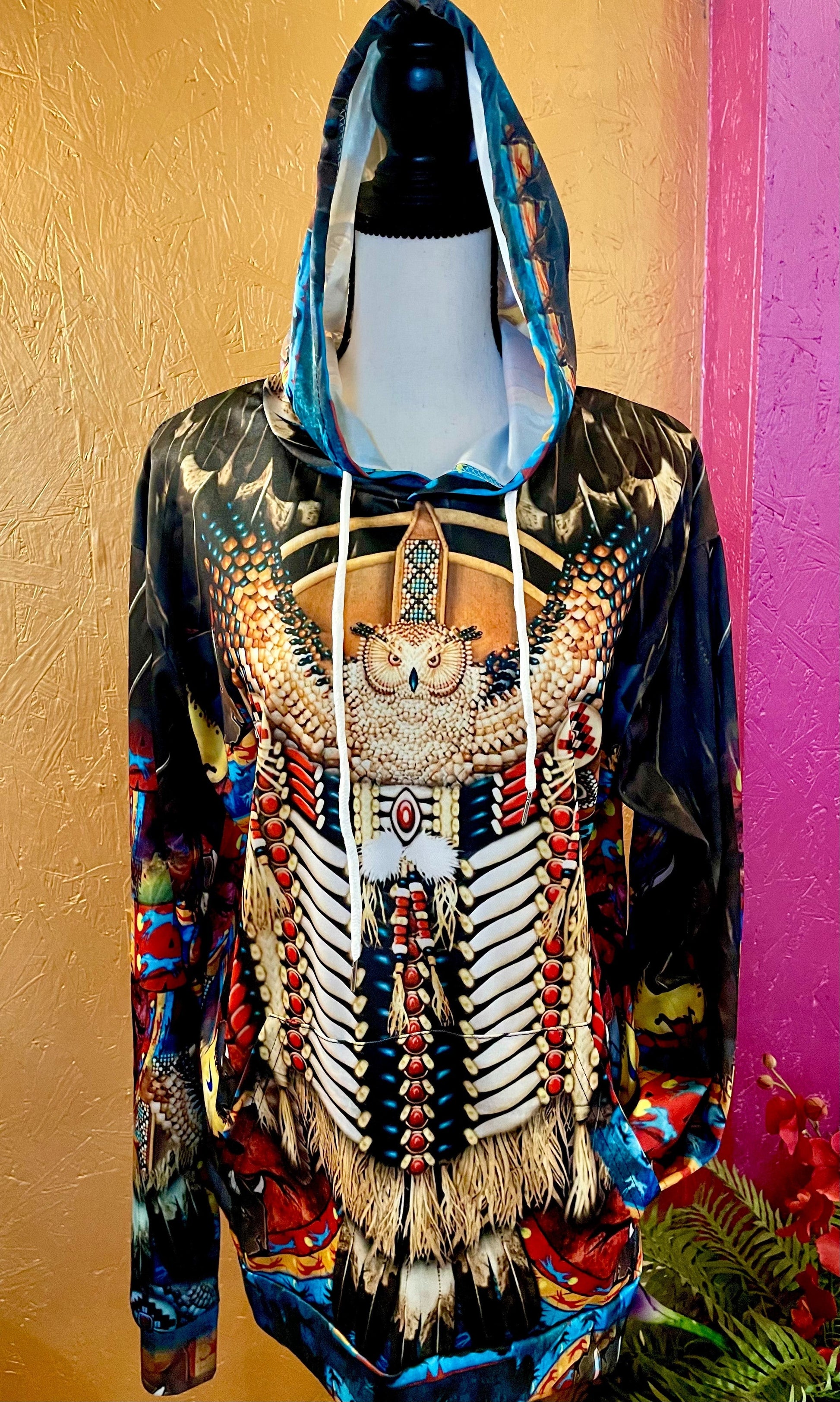 Experience the unique beauty of Native American art with our 3D Native American Owl Hoodie. Featuring a bold, lightweight design in a poly blend material, this unisex hoodie is perfect for adding a touch of cultural flair to any outfit. Stand out in style with this eye-catching piece.