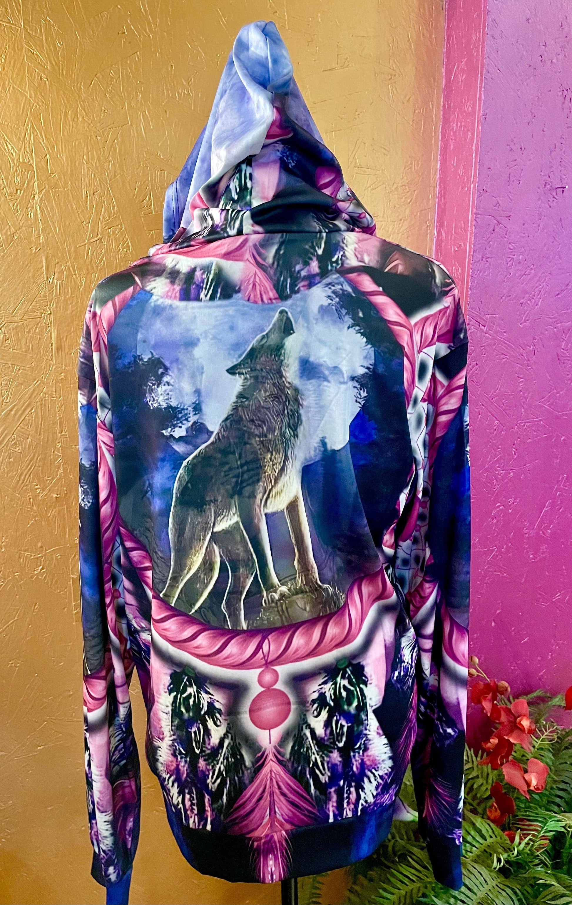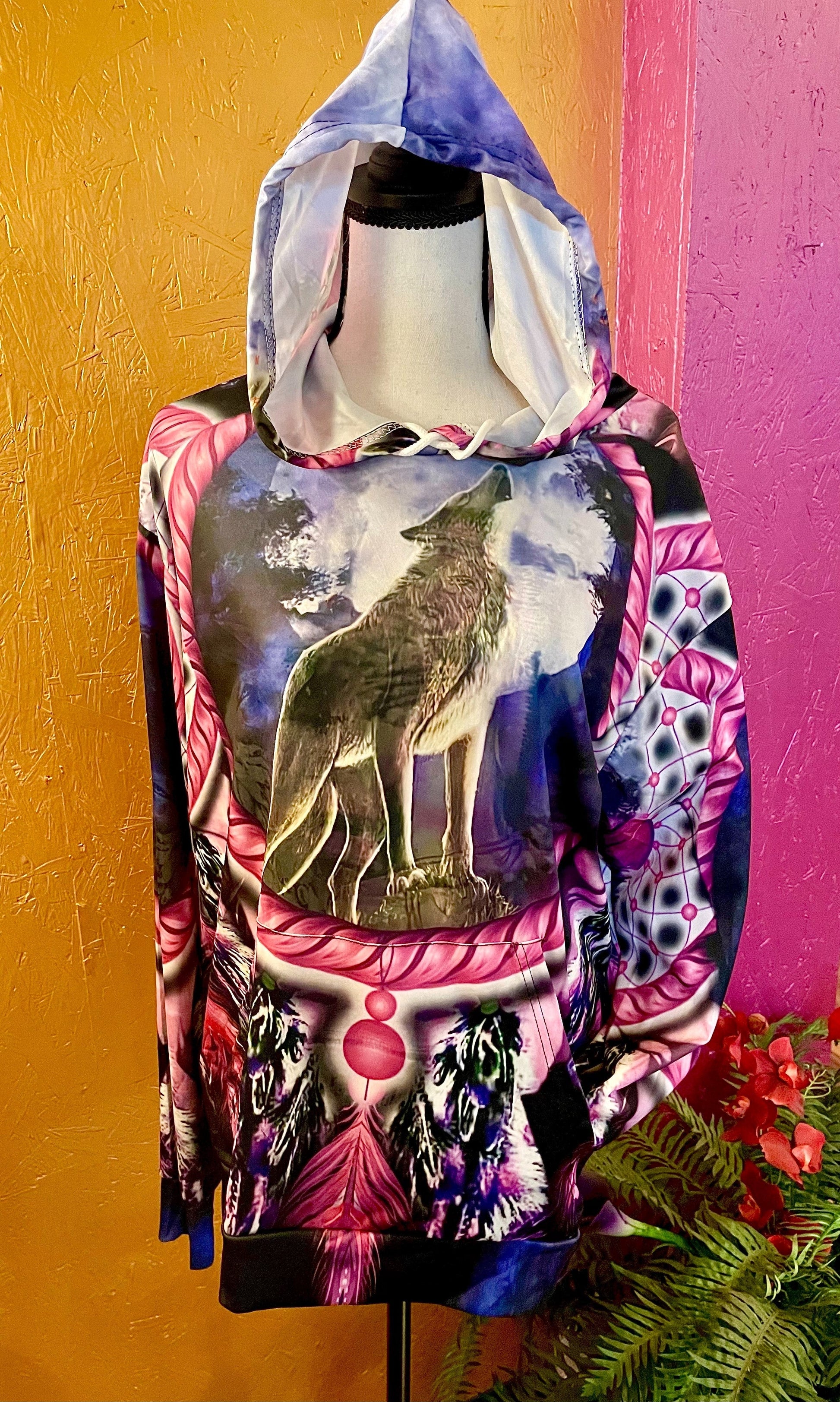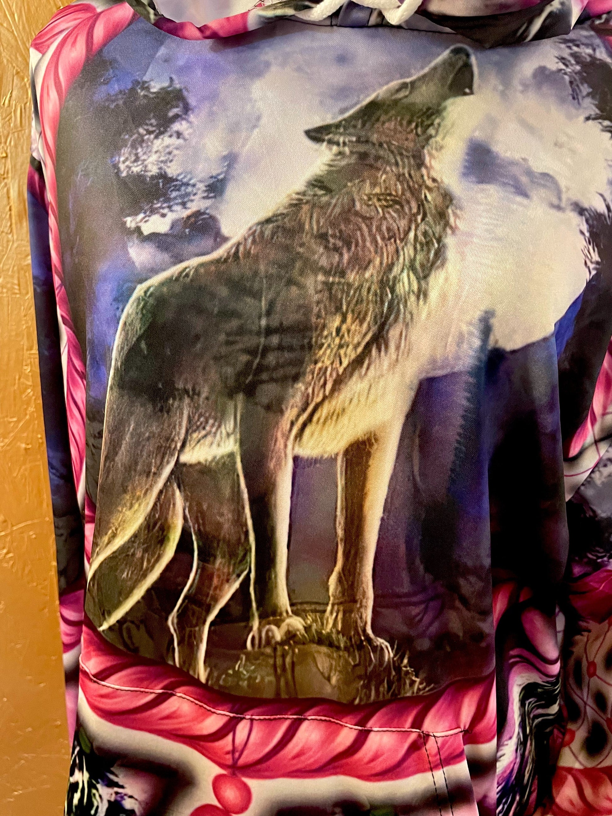 Experience the power of nature with our 3D Wolf Hoodie. Bold, bright colors and native american designs bring this howling wolf to life. Made from a lightweight poly blend, this long unisex hoodie is perfect for any adventure.