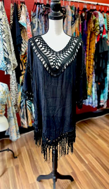 Embrace your inner beach goddess with the Black Fringe Ladies Coverup from The Enchanted Bazaar. This stunning piece is designed to turn heads and elevate your summer style. Perfect for beach days or casual outings, this coverup combines comfort with a touch of playful elegance.