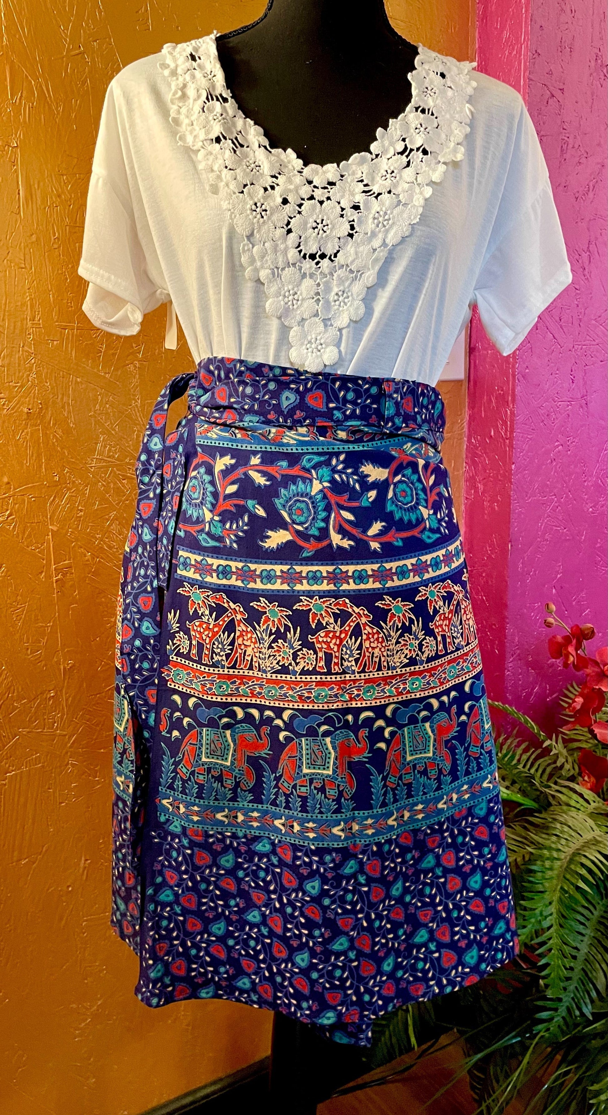 This Royal Blue Boho Elephant Print Wrap Skirt is made of breathable cotton, perfect for hot summer days. With its bohemian style and vibrant elephant print, this skirt is a versatile addition to any wardrobe. Stay stylish and comfortable with this unique and trendy piece.