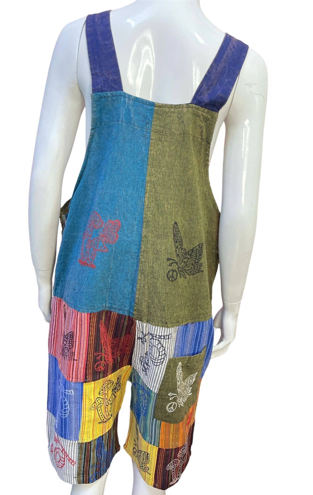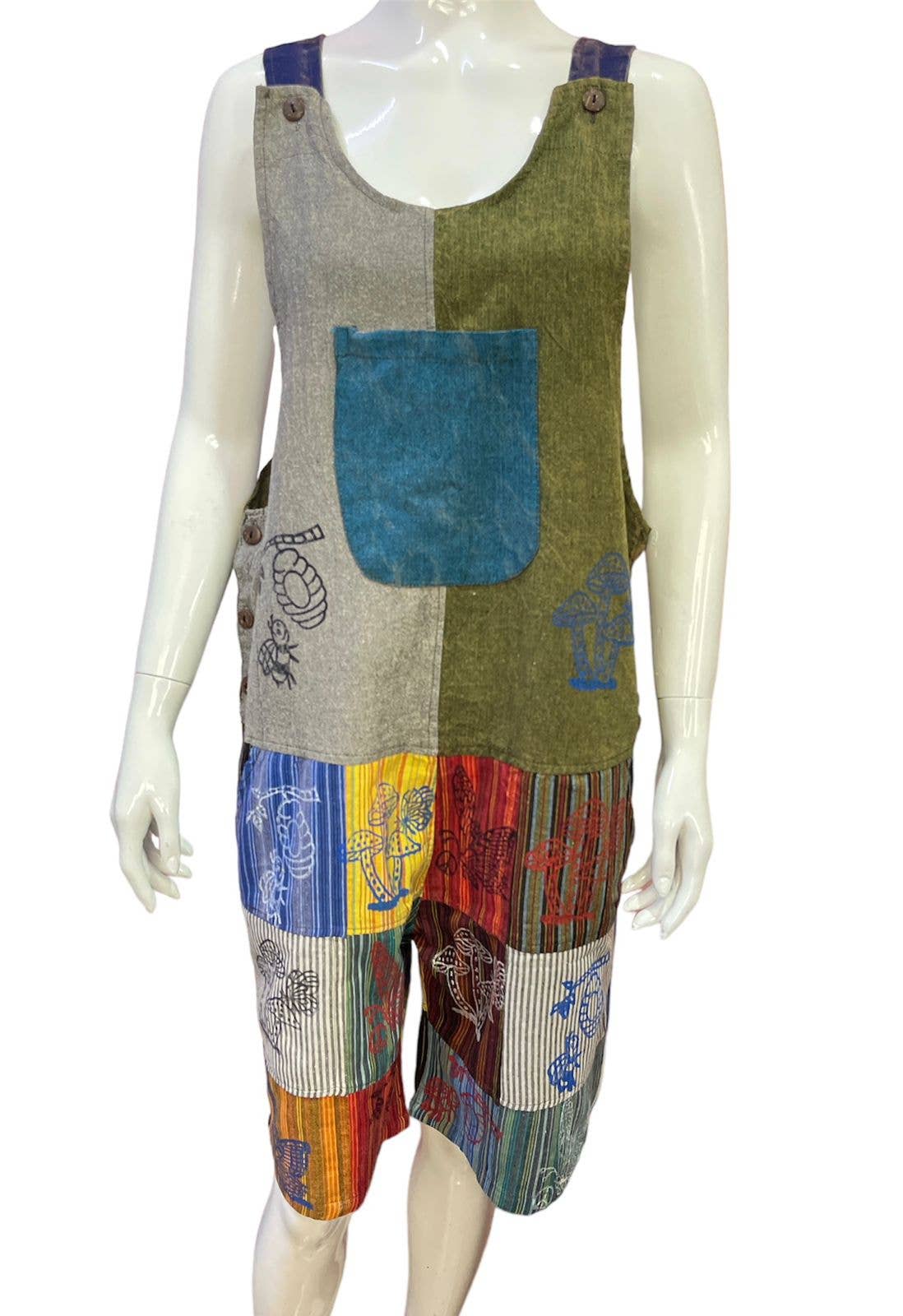 This playful romper features vibrant butterfly, mushroom, and bee patches on soft cotton fabric, perfect for festival fun or casual days. Its two-panel design offers comfort and style, making it an easy choice for sunny adventures and whimsical vibes. Embrace the magic of the Himalayas with this charming, nature-inspired piece.