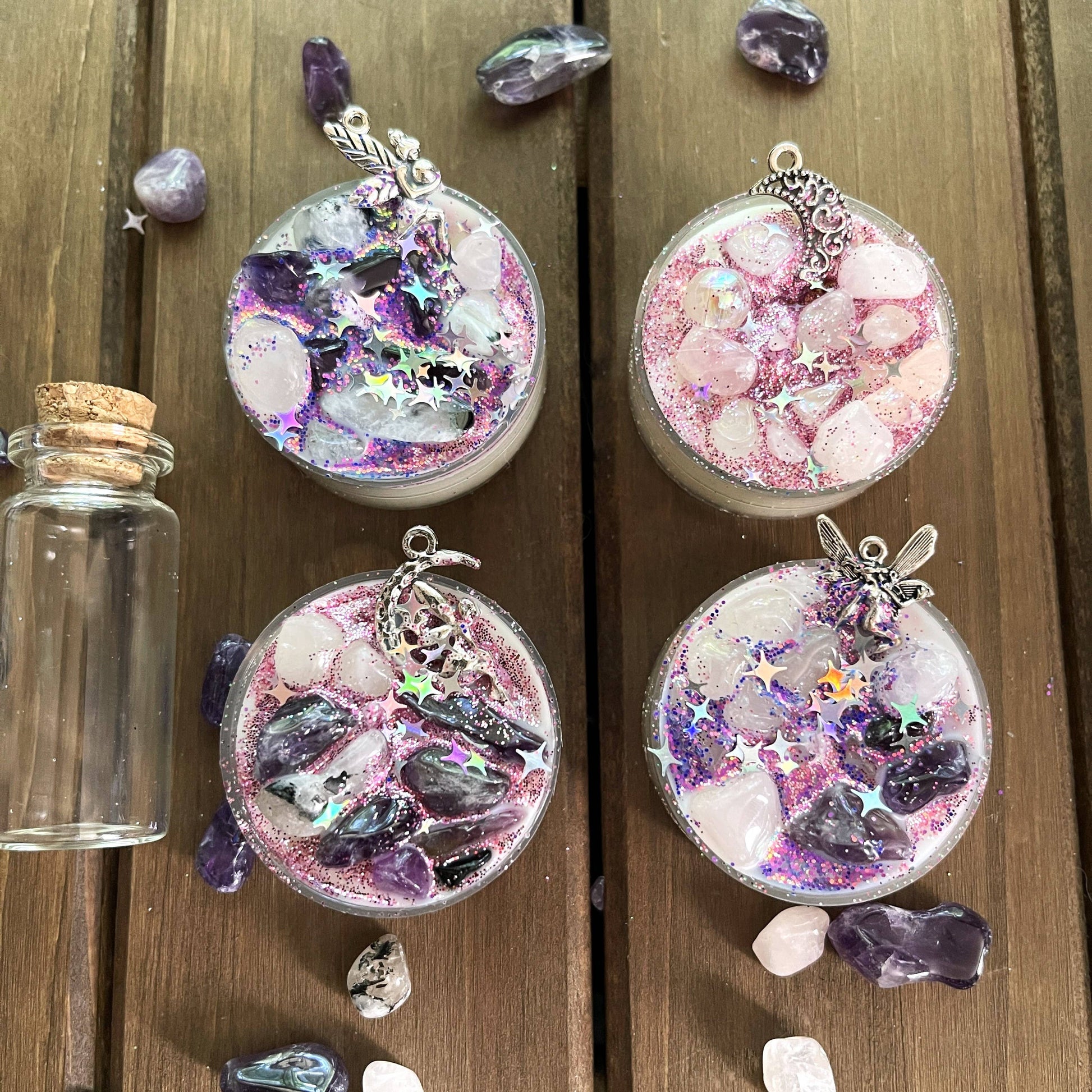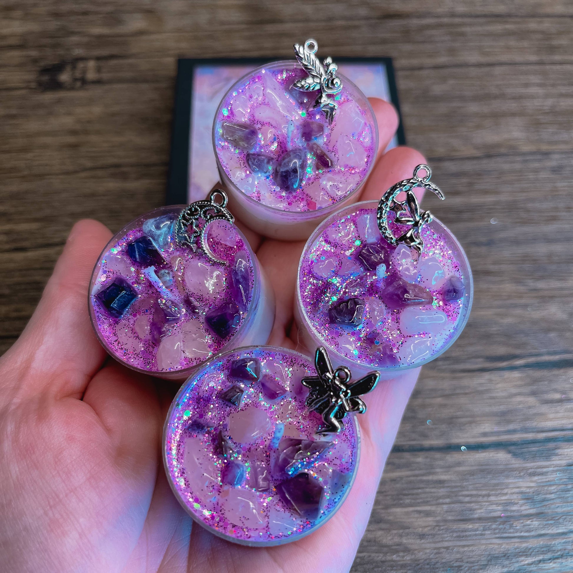 Our Faerie Dust tealight candles are decorated with a crescent moon charm and 3 fairy charms, and crystal chips (rose quartz and amethyst).