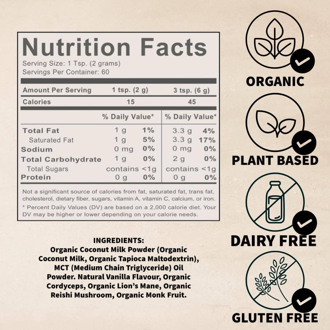This coconut-based vanilla flavoured powdered creamer is made with functional and organic ingredients: Coconut milk, MCT oil, and 3 adaptogenic mushrooms (Lion’s Mane, Reishi, Cordyceps). It transforms an ordinary cup of coffee into an extraordinary functional beverage.