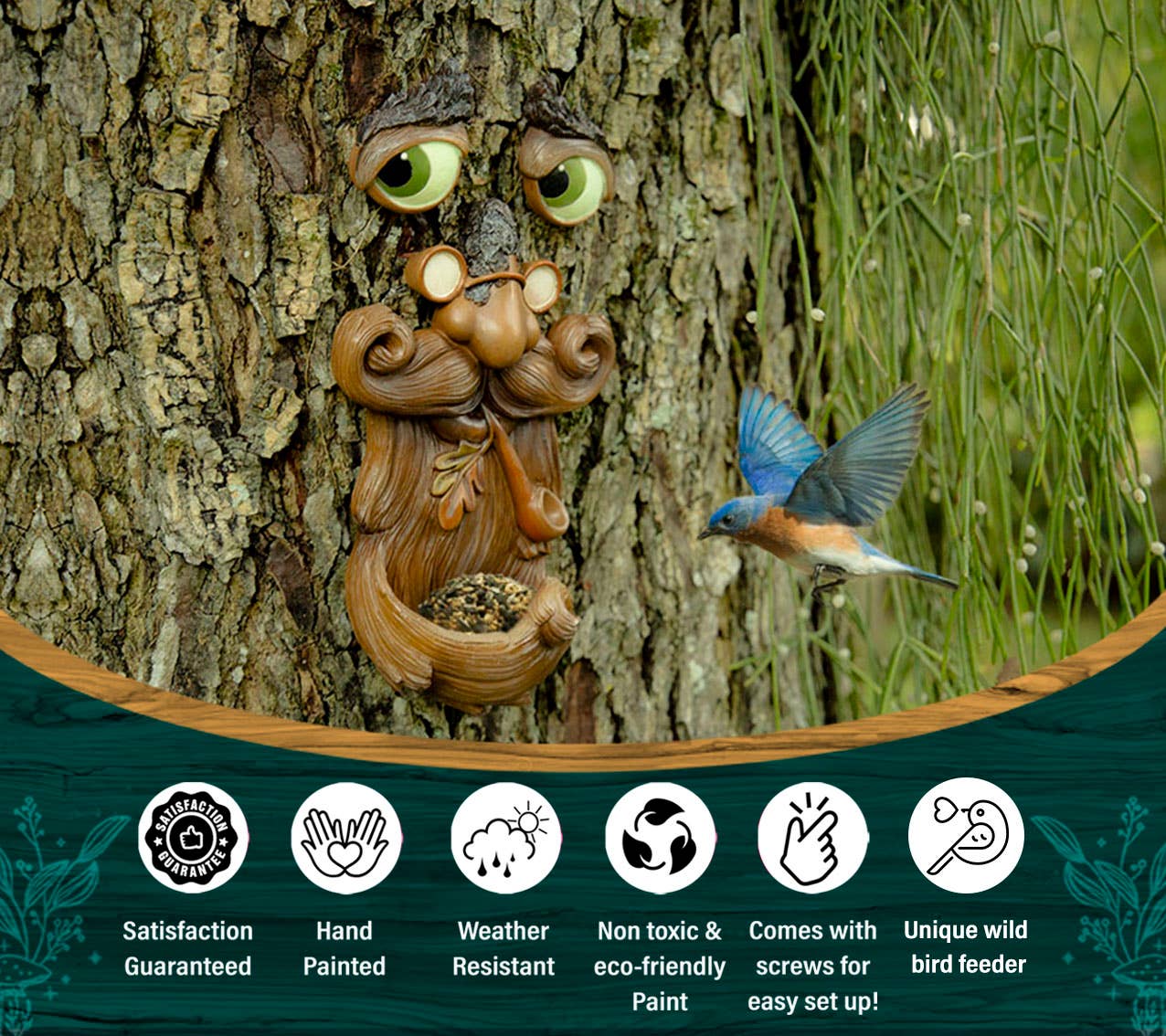 Made to Last: This tree face bird feeder is made of polyresin, a durable and sturdy material that will pass the test of time. The tree bird feeder is hand-painted using non-toxic and eco-friendly paint that will not fade.