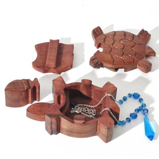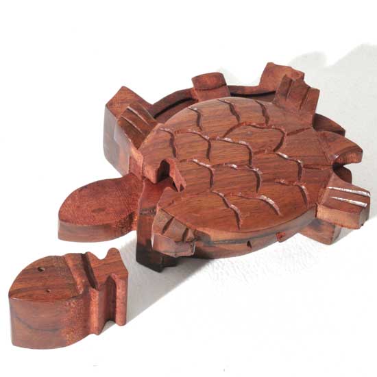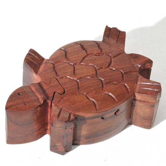 Discover the exquisite Wood Puzzle Box - Turtle, a stunning handcrafted piece that beautifully combines art and functionality. This charming turtle-shaped puzzle box is meticulously hand-carved from durable, richly grained Sheesham wood, renowned for its strength and natural beauty. This artisan-made jewelry or keepsake box from India not only serves as a unique decorative item but also as a delightful puzzle to engage with.