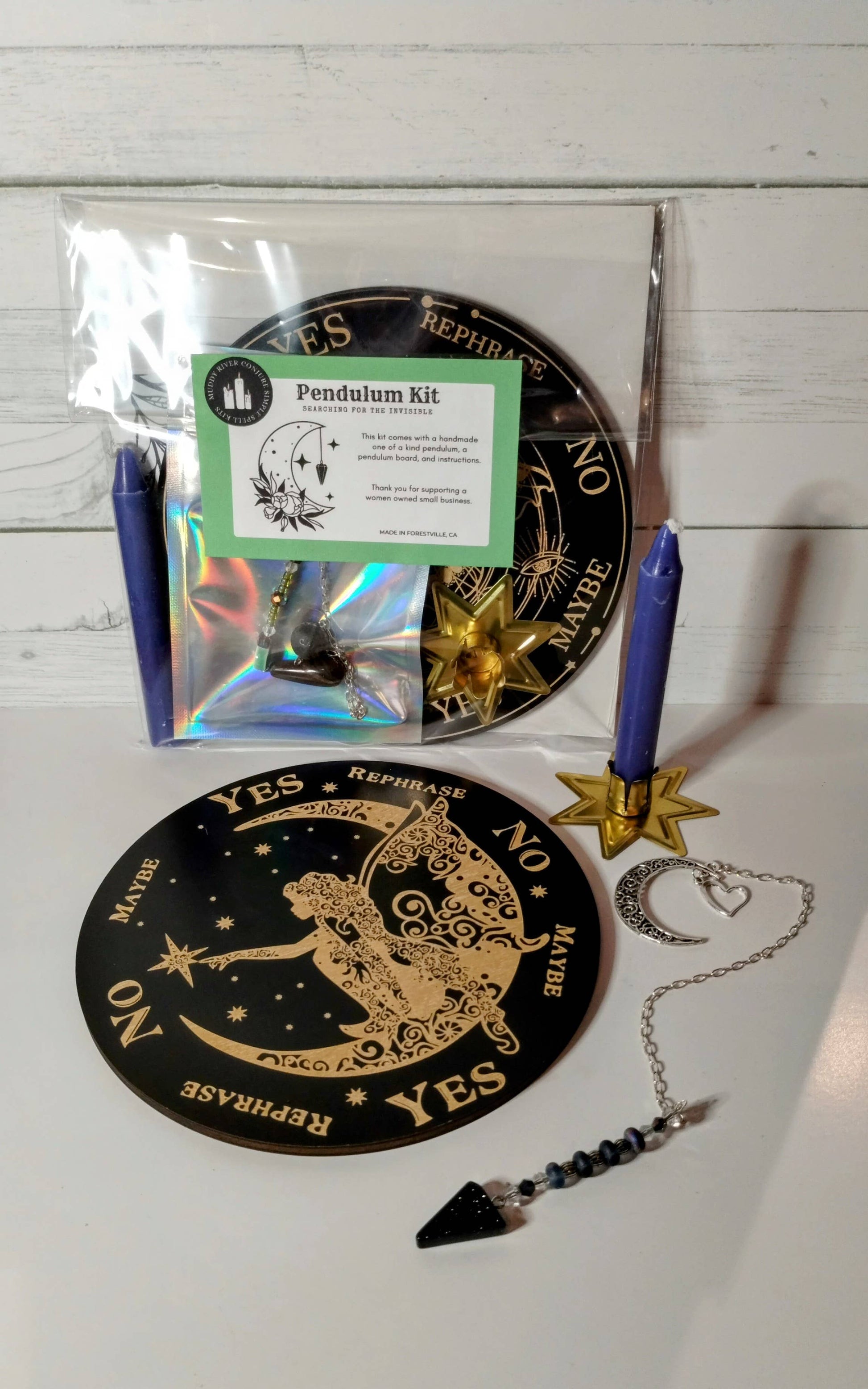 Our popular hand made pendulums are now available in a complete kit with a pendulum board, and instructions. We have also added a chime candle and holder to help with meditation and the mood when practicing divination.