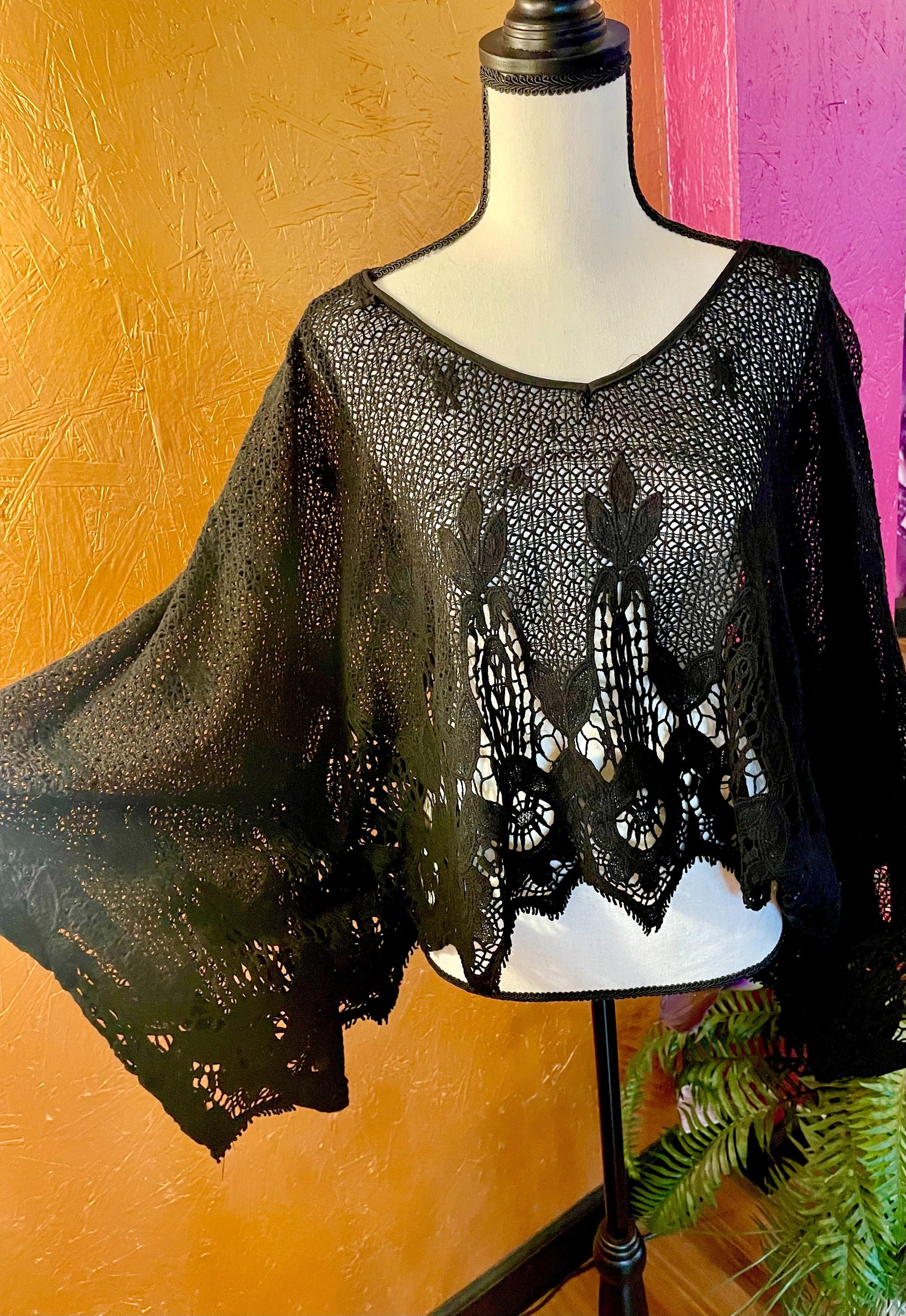 Discover the unique style and versatility of our Crocheted Bat Wing Top. Handcrafted with intricate crochet details, this black ladies top features a flattering bat wing design and a cropped fit that will make a statement in any wardrobe. Perfect for a bohemian-chic look, this top will be a stylish addition to any outfit.