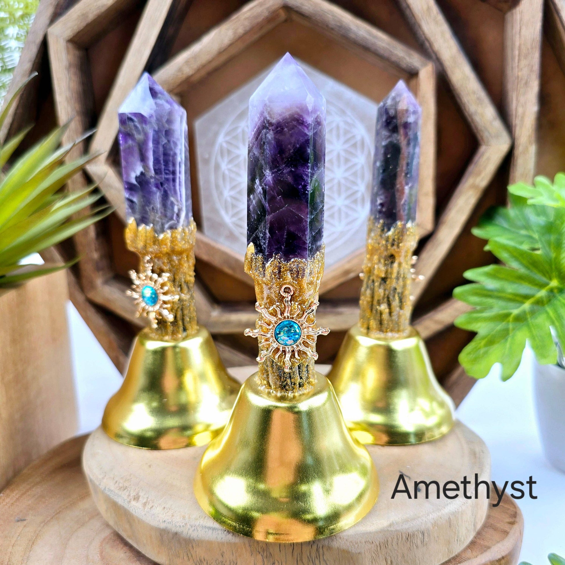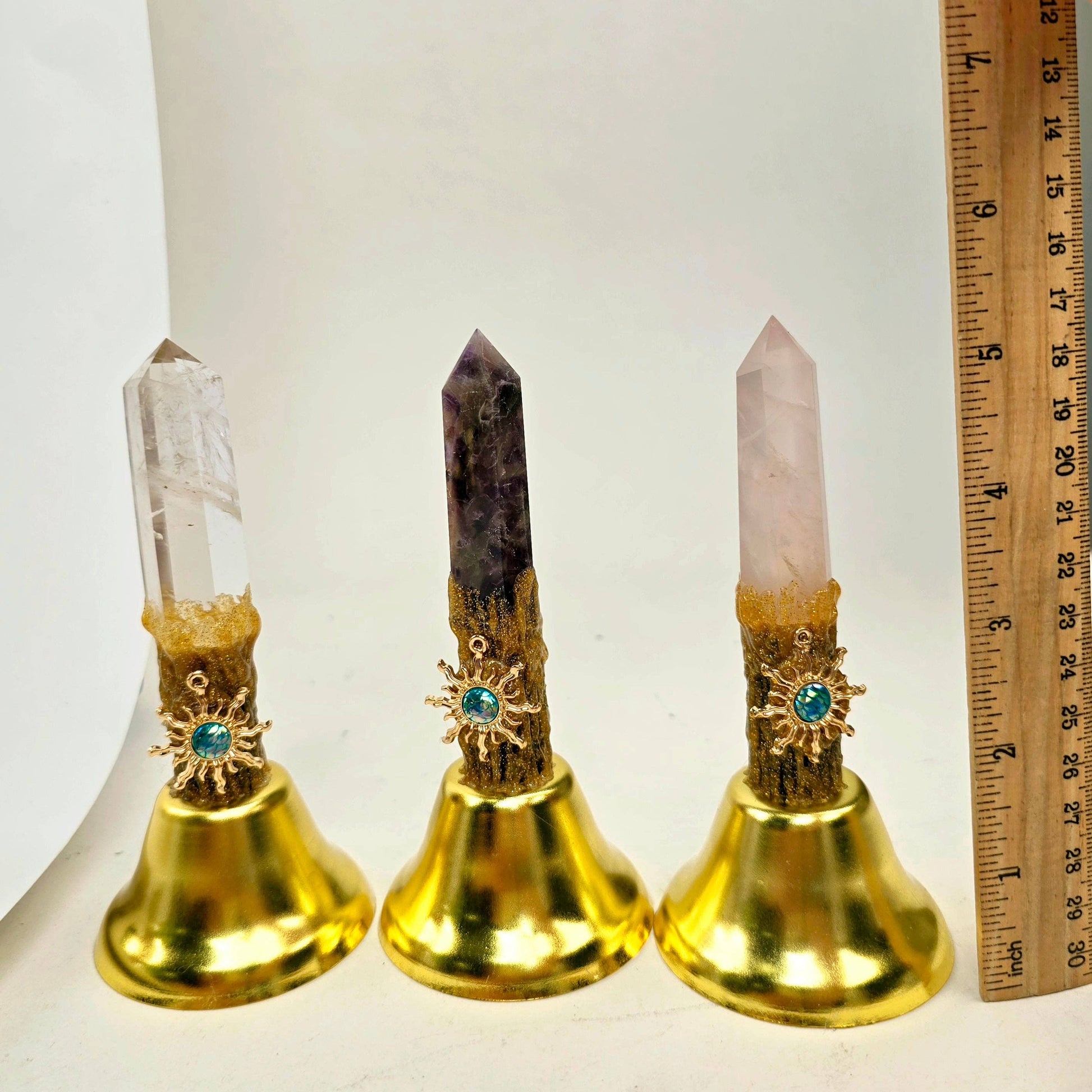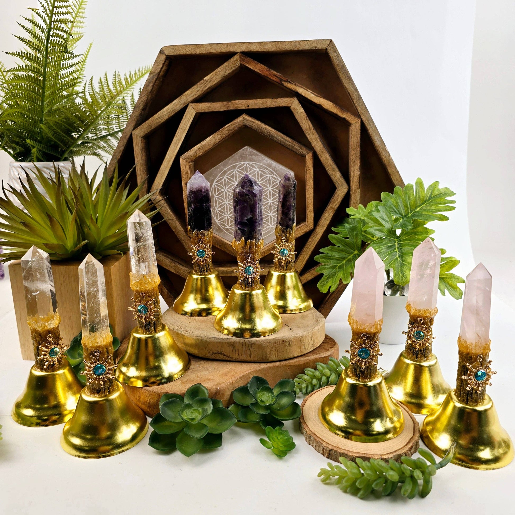 Bring positive energy and blessings into your life with our Crystal Point Bell with Sun Charm. Choose from Crystal Quartz, Amethyst, or Rose Quartz Points to suit your needs. Perfect for celebrations and everyday use, they emit a beautiful, loud and striking tone. Experience the power of crystal vibrations and elevate your surroundings with these beautiful bells!