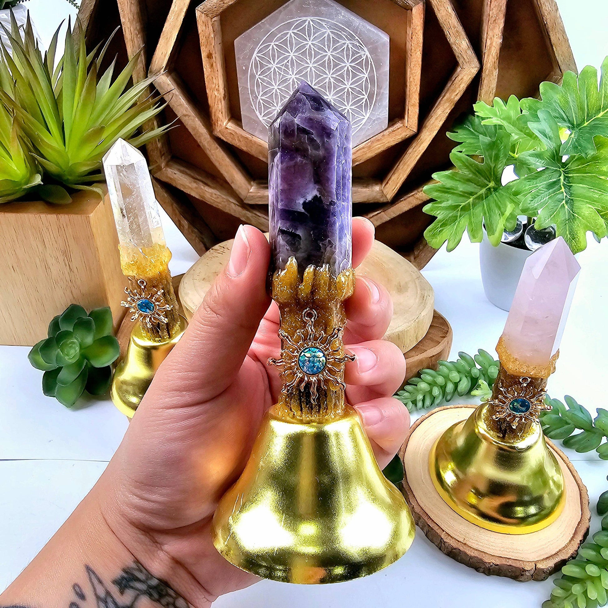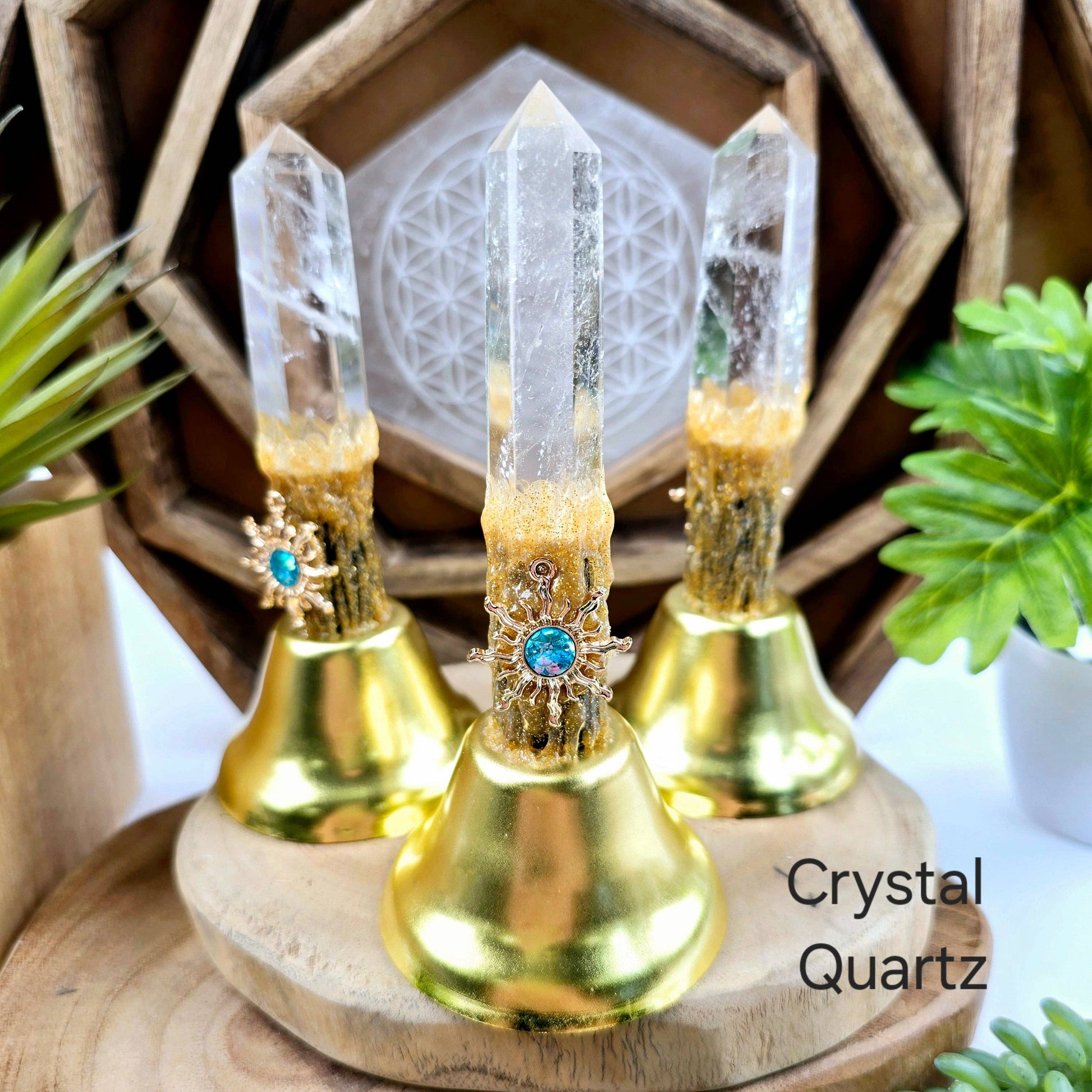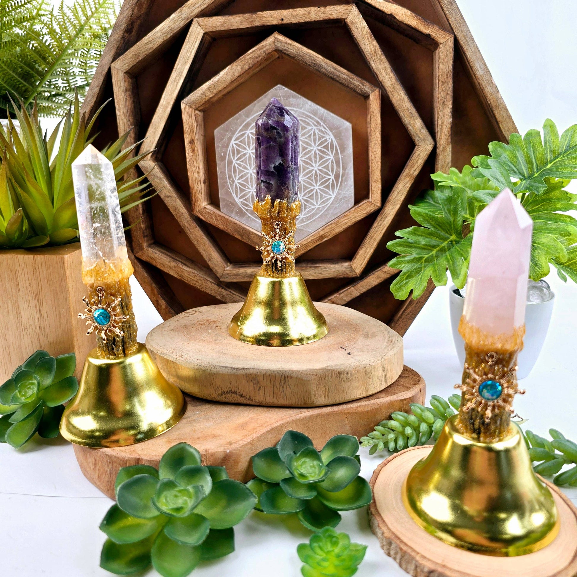 Bring positive energy and blessings into your life with our Crystal Point Bell with Sun Charm. Choose from Crystal Quartz, Amethyst, or Rose Quartz Points to suit your needs. Perfect for celebrations and everyday use, they emit a beautiful, loud and striking tone. Experience the power of crystal vibrations and elevate your surroundings with these beautiful bells!
