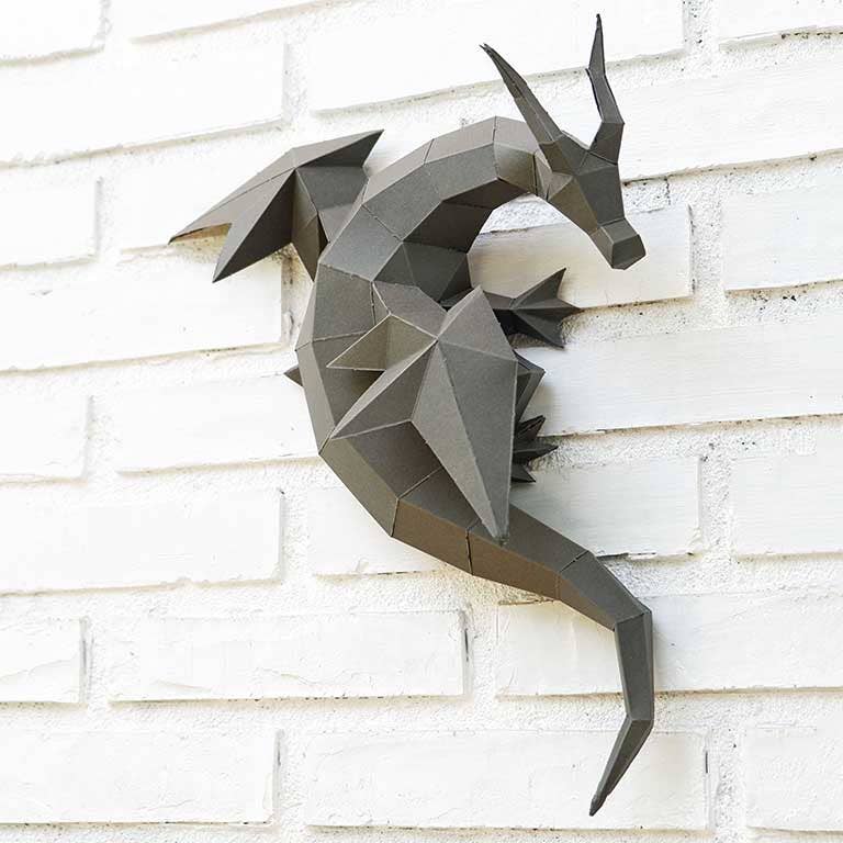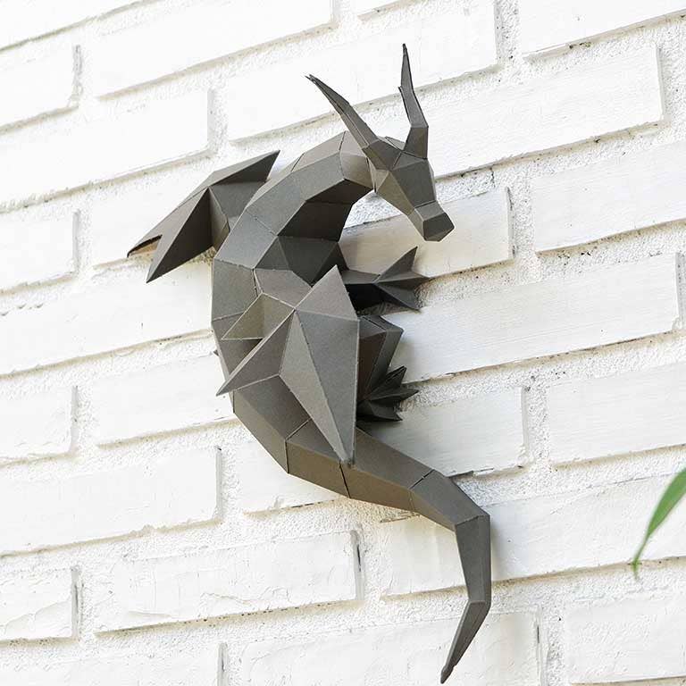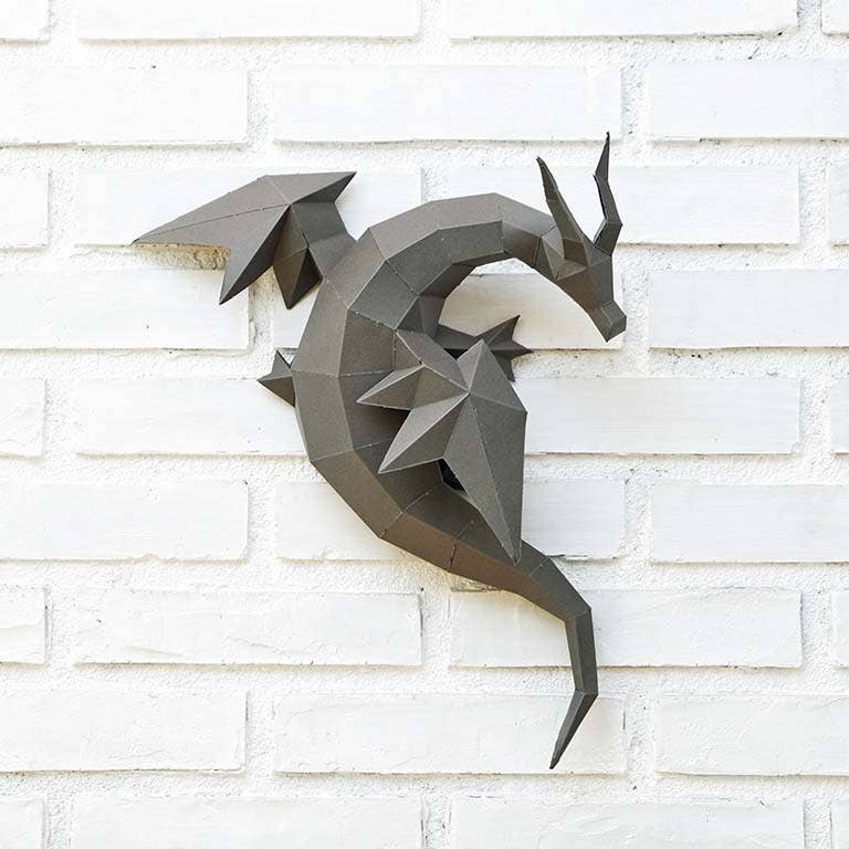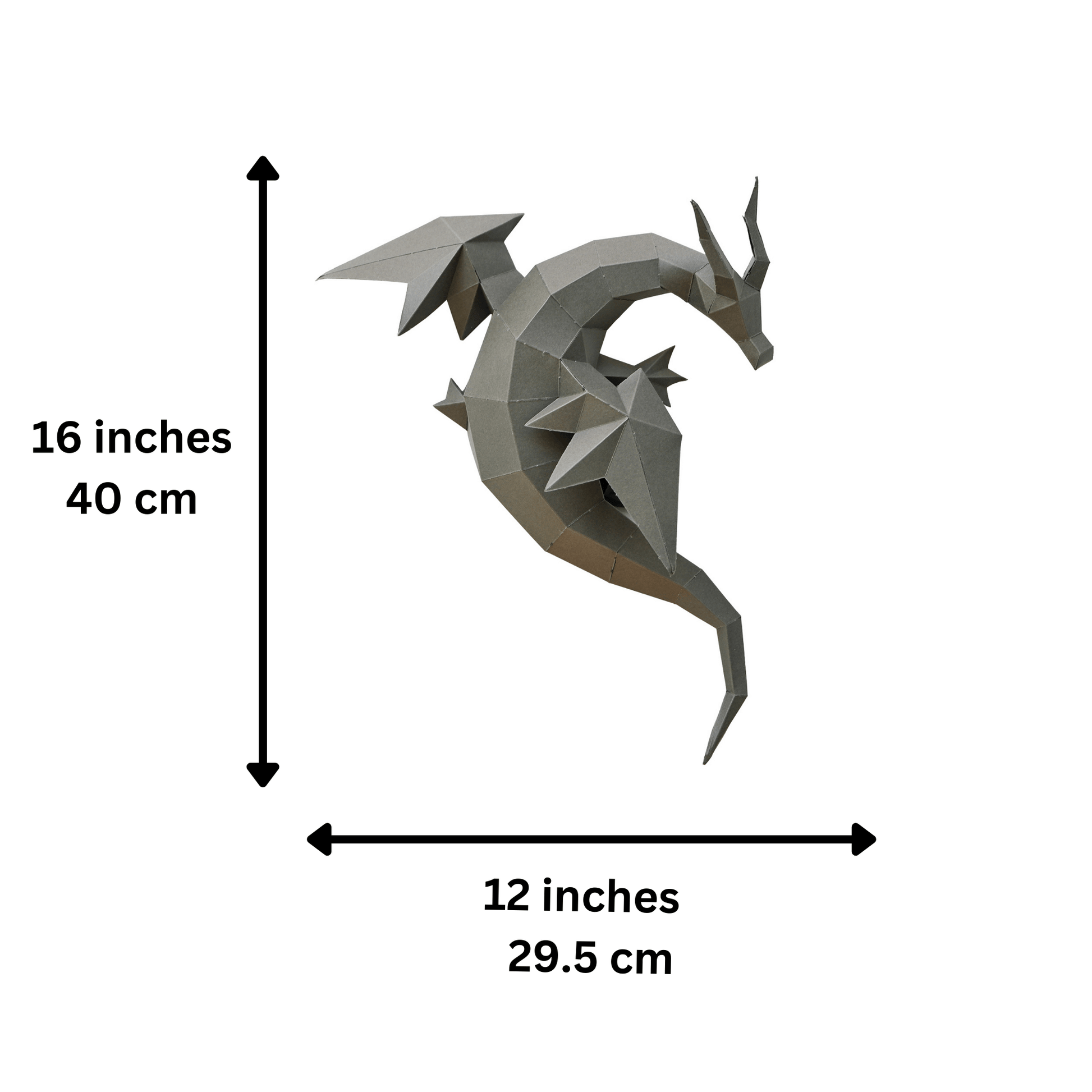 PRE-CUT and PRE-FOLDED Paper Craft Origami. Enter the dragon’s lair. A fascinating 3D figurine taking the shape of a wall-scaling firebreather, this 3D paper dragon decoration turns any ordinary wall into a fantasy land of dreams. -Enjoy a calming and rewarding experience. -Bring life and character to any room. -An excellent bonding activity for family & friends of all ages. -Disconnect from devices and reconnect to creativity. This product is made for everyone & only requires a little patience and time. Just follow the instructions and have fun! -No scissors needed. -100% recycled materials and fully recyclable. Difficulty: ★★ Easy Measures HxWxD (cm/in): 40cm x 29.5cm x 11.5cm / 15.8" x 11.6" x 4.53" Material: Fortified 250gsm paperboard (pearlescent).
