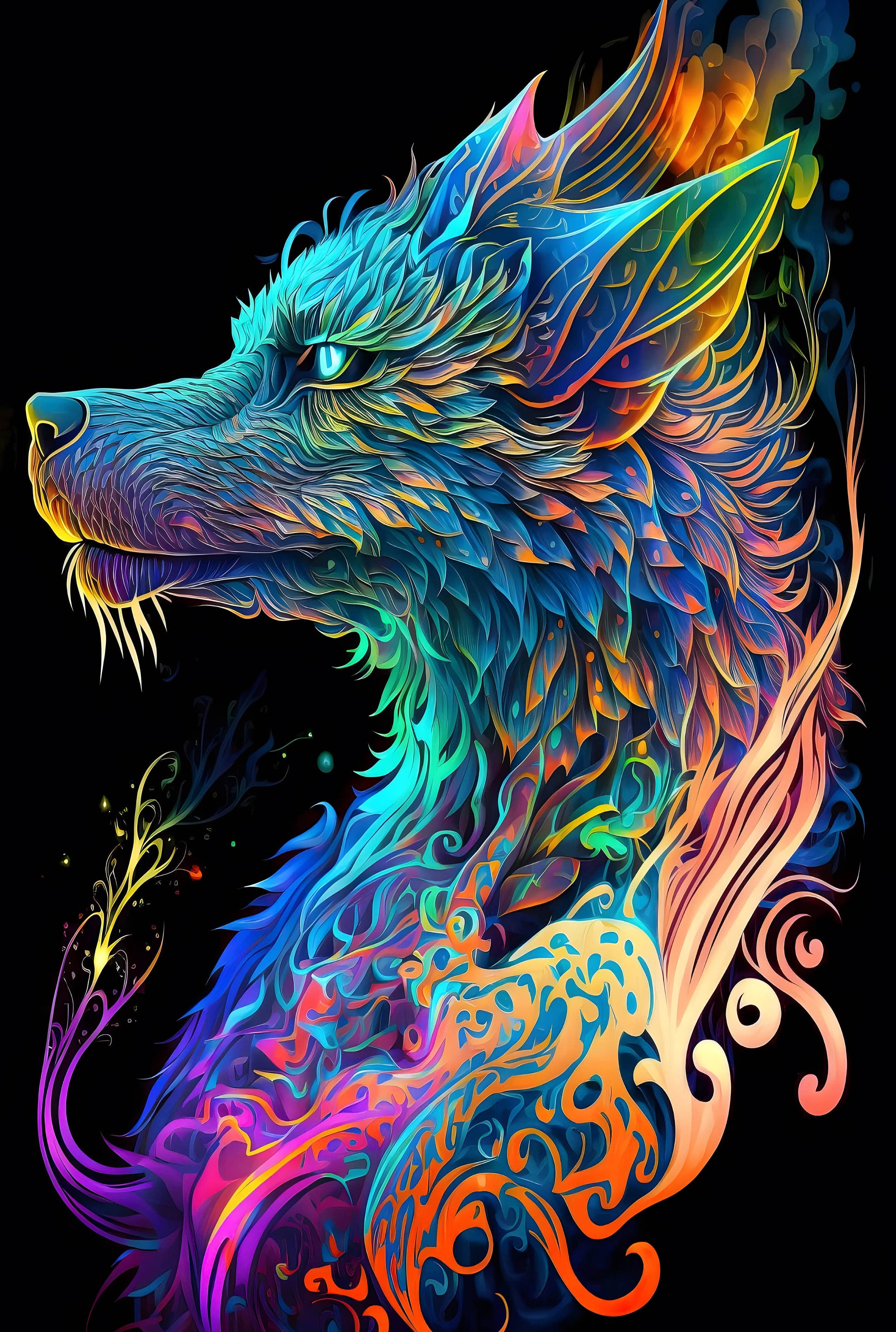 Unleash the cosmic fusion. Imagine a world where two mystical creatures, the fierce wolf and the majestic dragon collide in a whirlwind of vibrant colors. This tapestry is a psychedelic symphony of shades merging the wolfs earthy wisdom with the dragon's fiery spirit.