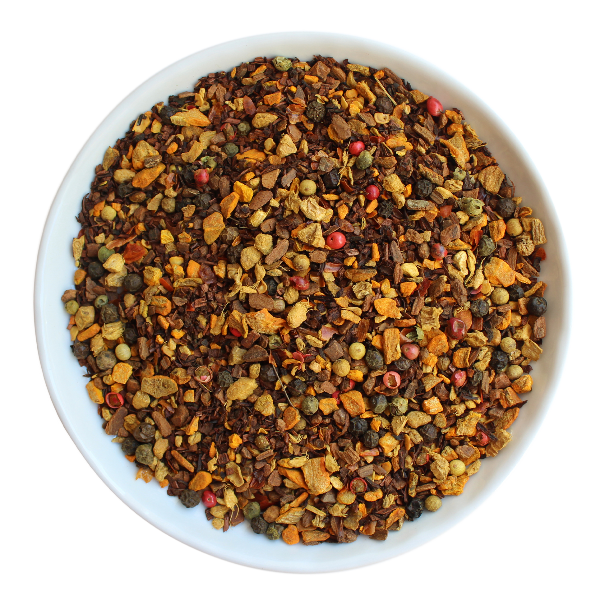 This delightful tea features a powerful combination of spicy turmeric, warming ginger root, and a hint of fiery chili, delivering a bold kick that awakens your senses. Each sip is thoughtfully balanced with the smooth sweetness of honeybush, creating a harmonious flavor profile that is both soothing and energizing.