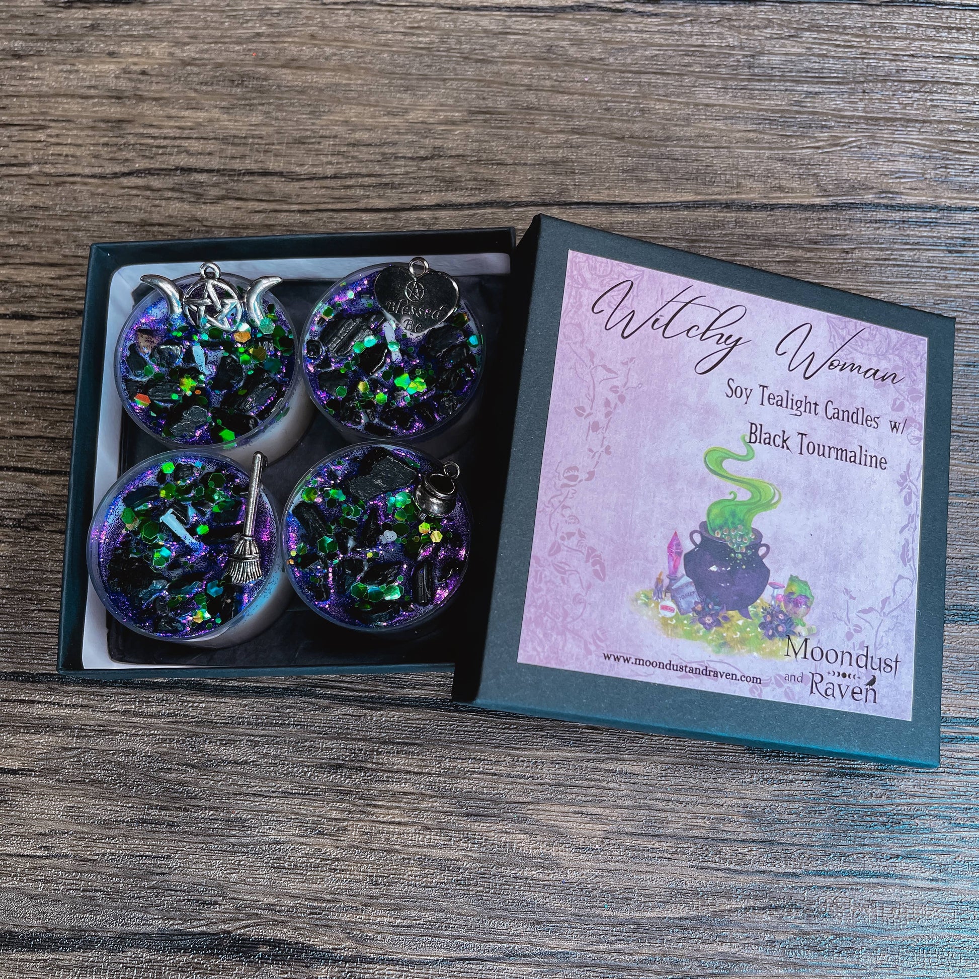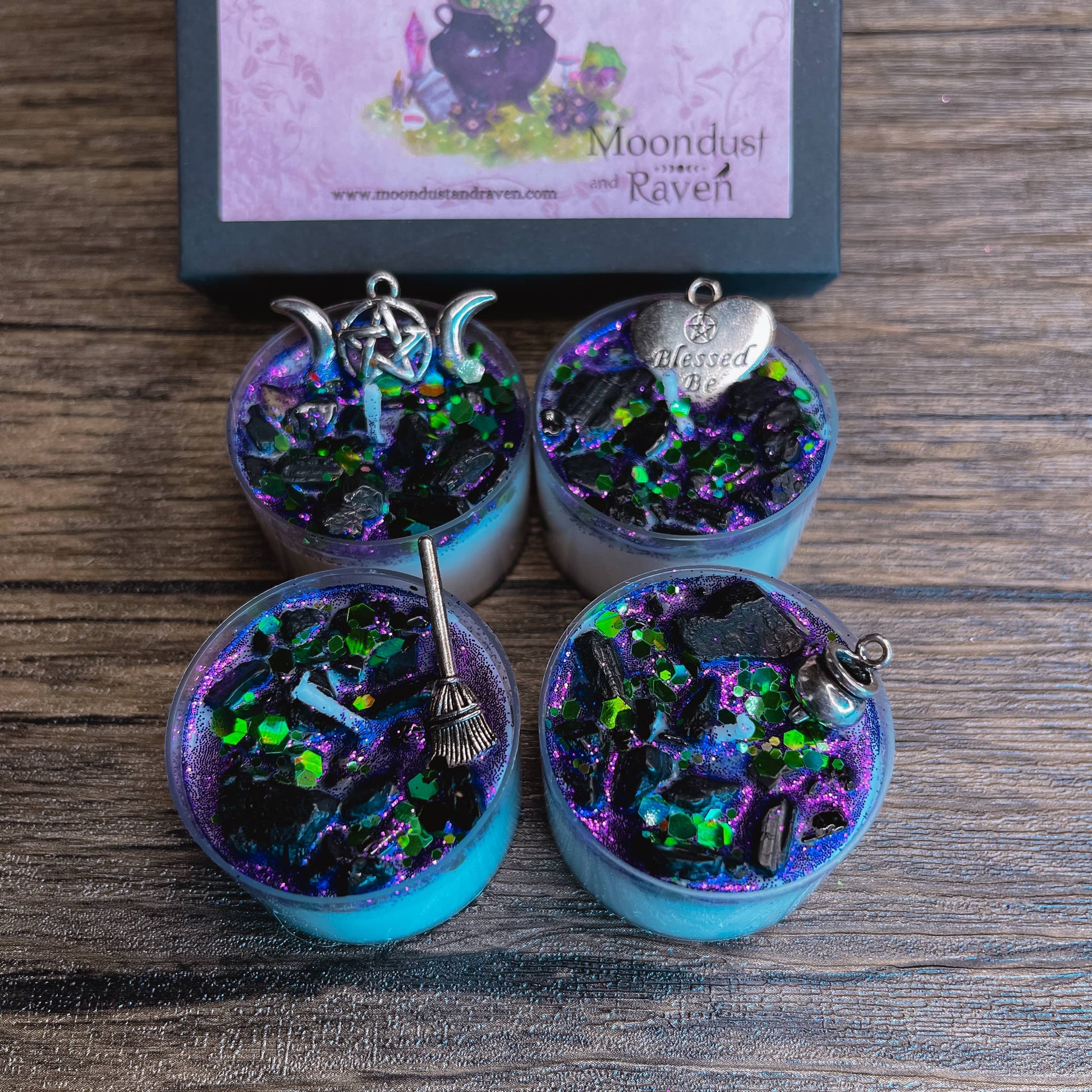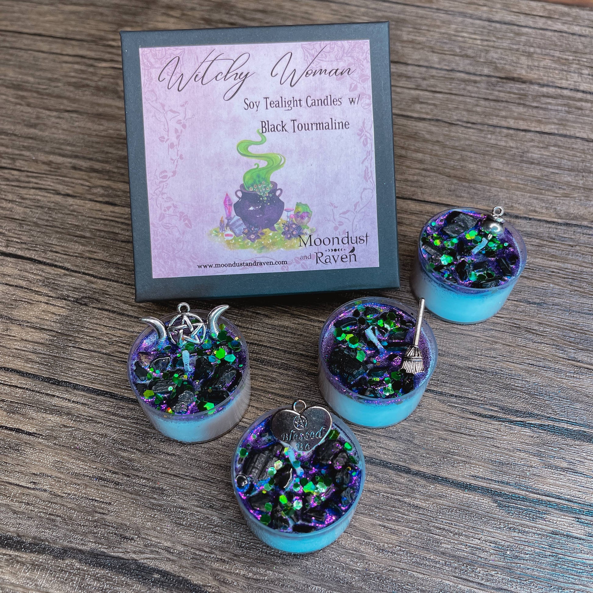 Our Witchy Woman tealight candles are decorated with a cauldron charm, triple moon pentacle charm, a blessed be heart charm, broom charm, black tourmaline crystal chips, and glitter (black, purple, and green).