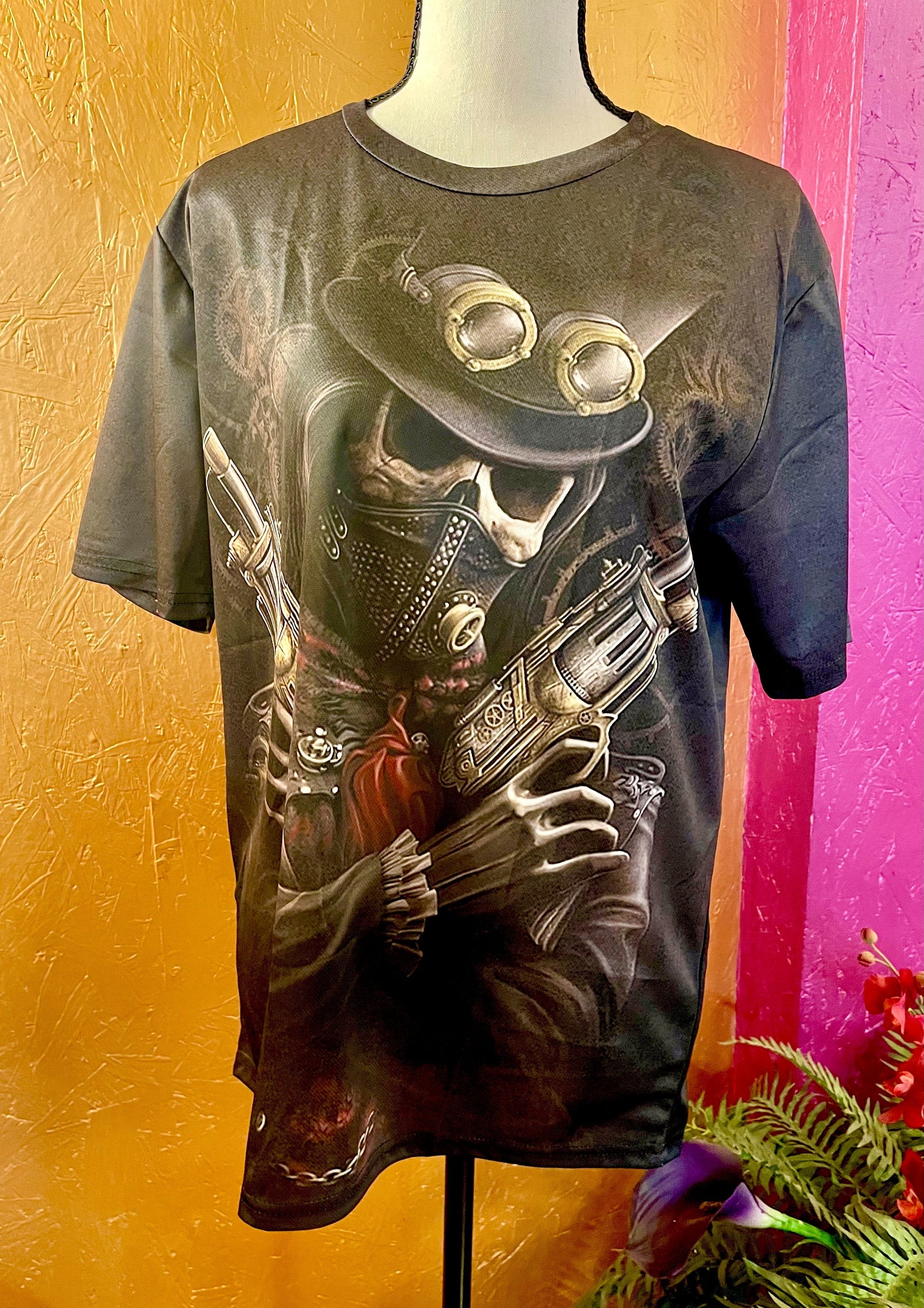 Unleash your inner rebel with our Short Sleeve Steampunk Skull T-Shirt. Crafted from a premium poly blend, this t-shirt promises unmatched comfort and durability, making it a must-have for your casual wardrobe.