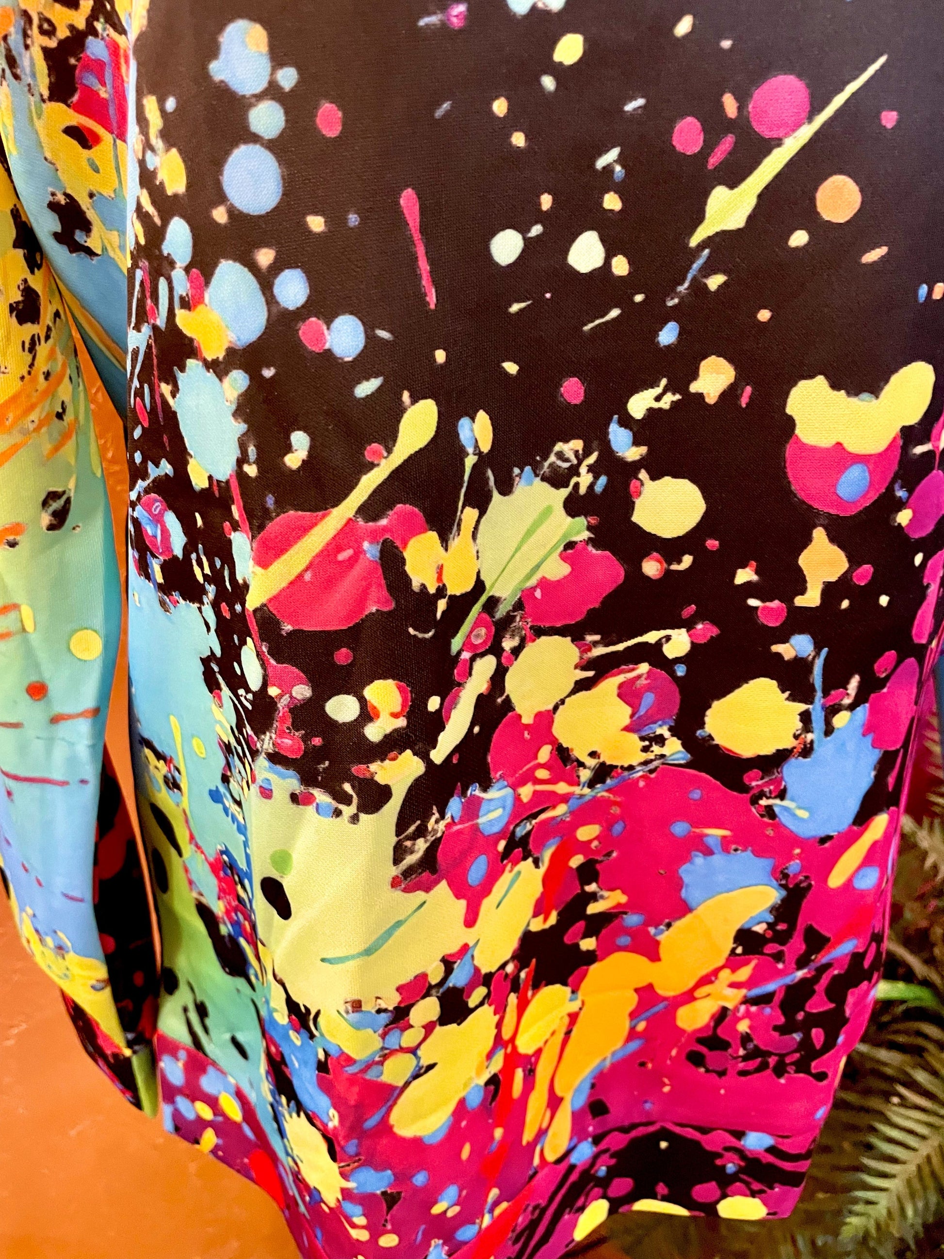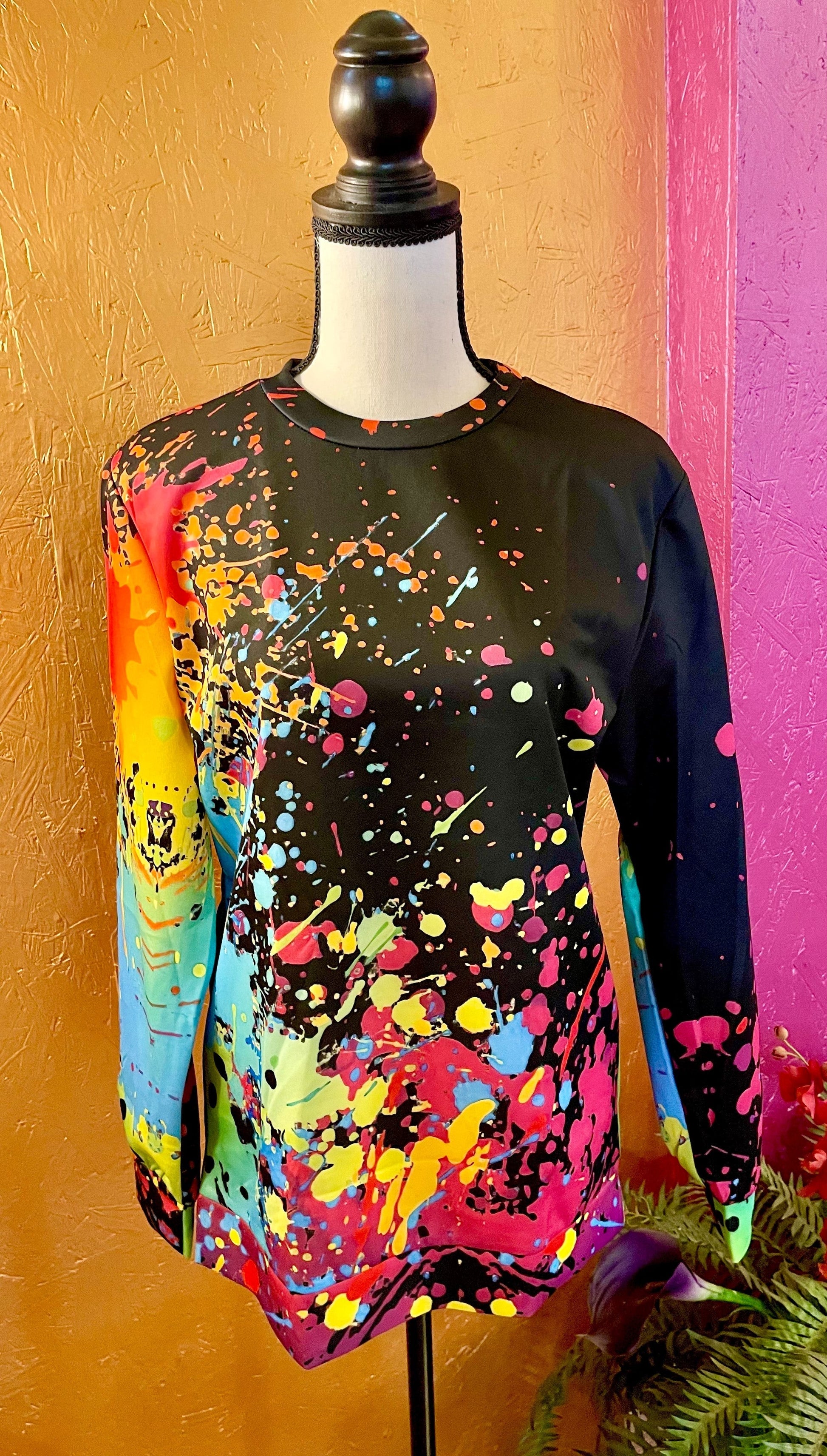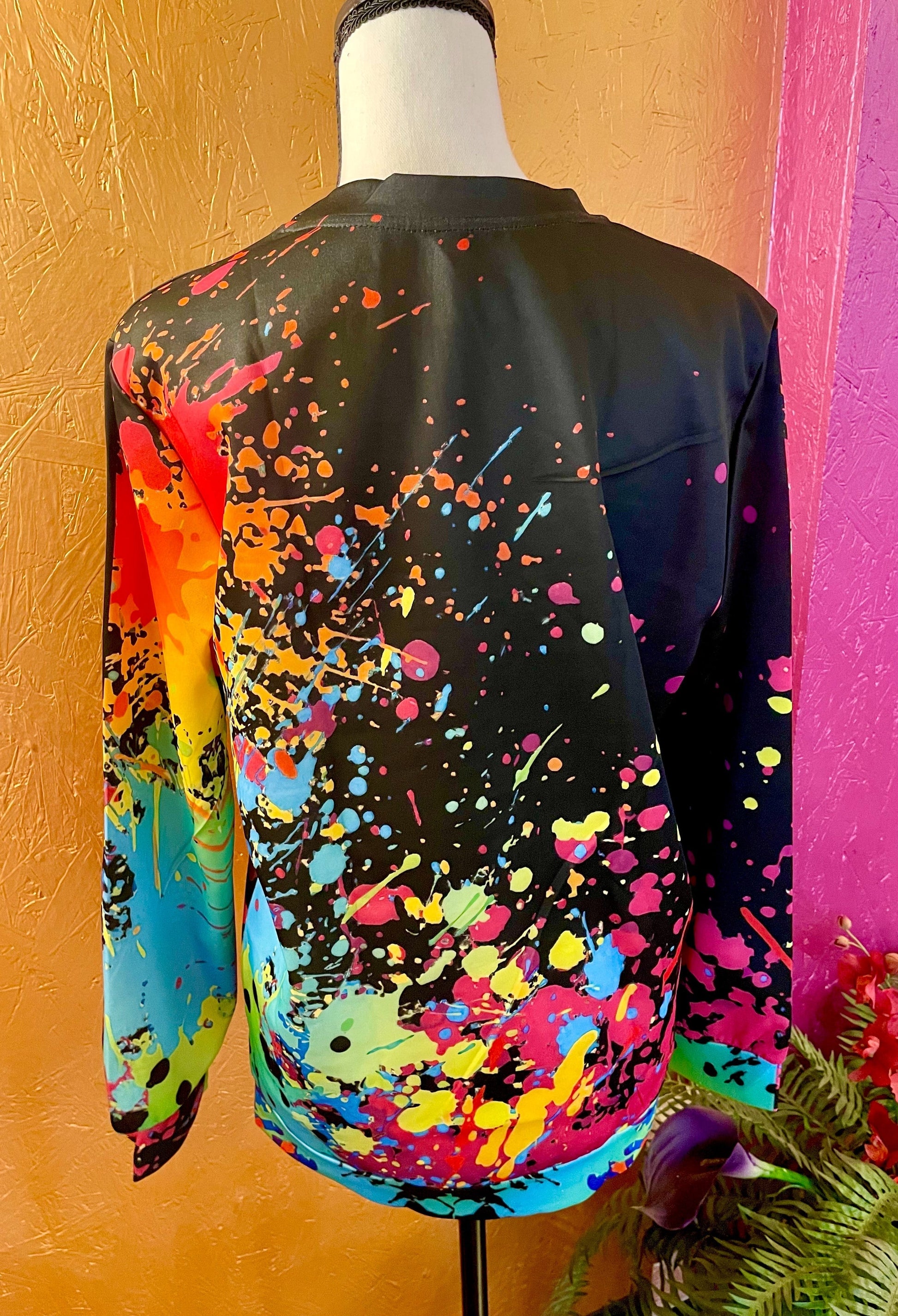 Expertly crafted with a lightweight poly blend, this striking 3D Paint Spatter Top is designed with a bold black base and eye-catching bright paint splatters. Perfect for any season, its crew neck and long sleeves provide both comfort and style. Suitable for all genders.