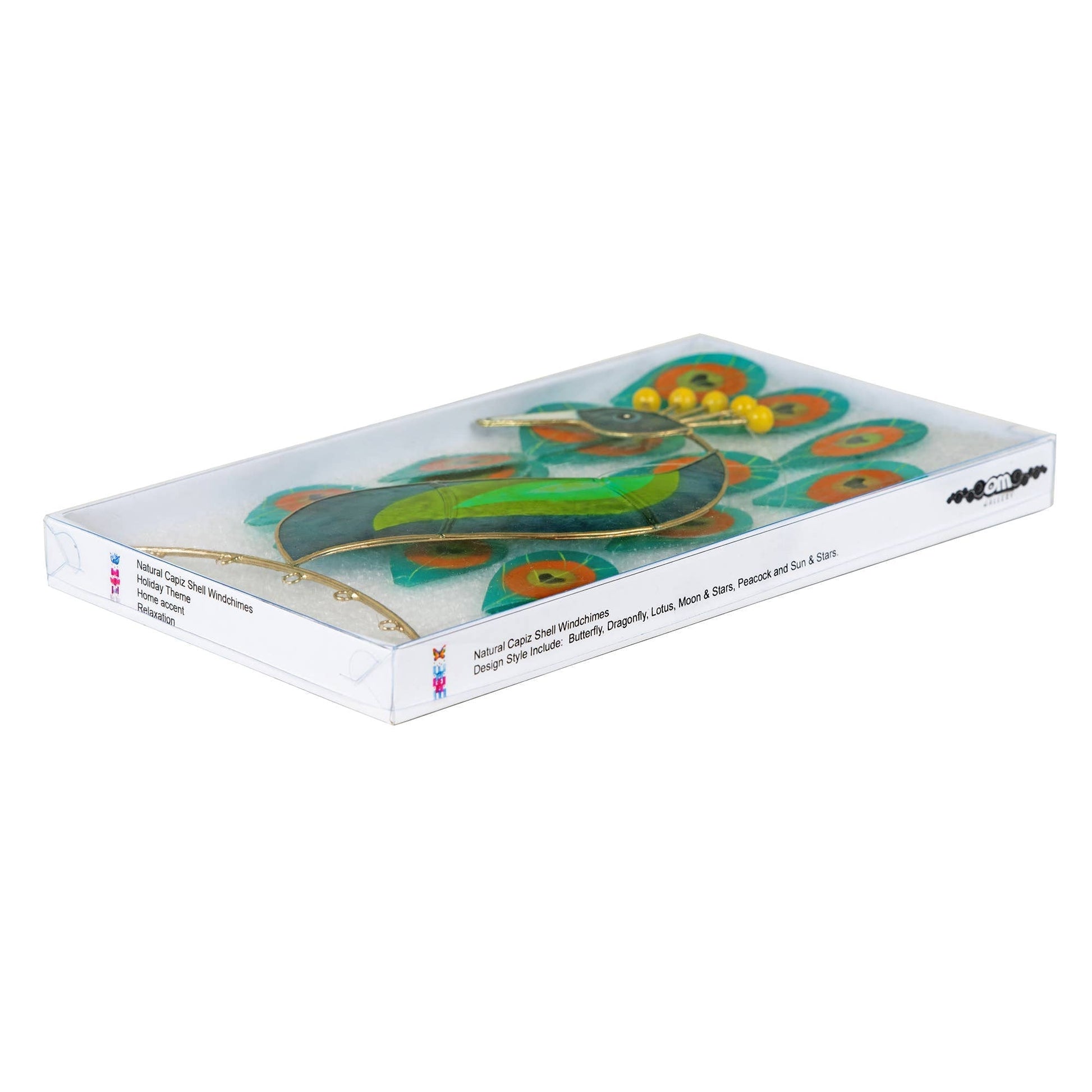 This captivating windchime is the result of collaboration between Om Gallery and skilled partners in the Philippines. Combining Capiz and a copper-plated metal frame, it features a delightful peacock design and measures 16" x 8". A charming addition to any outdoor area, it's masterfully crafted and sure to bring whimsy to your space.