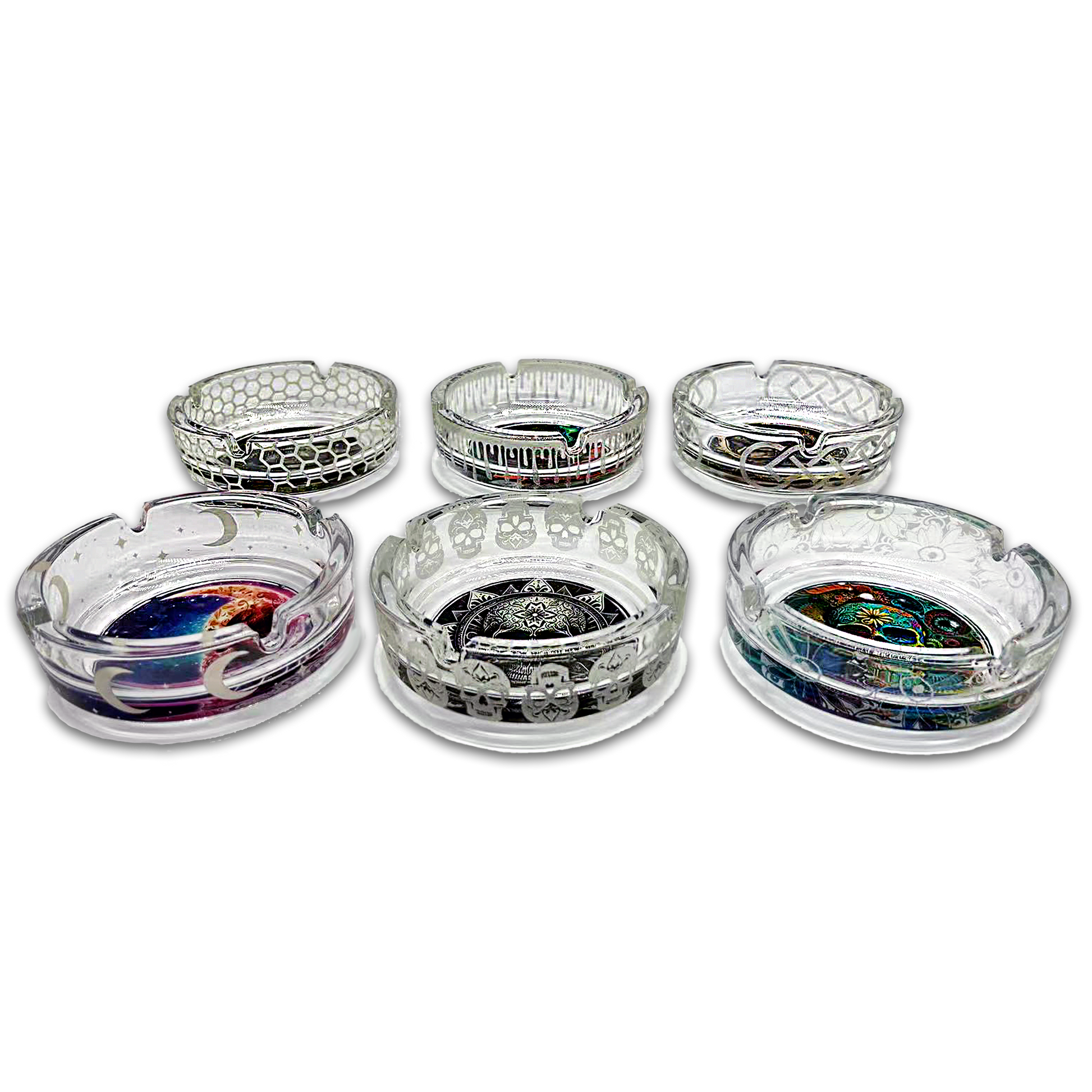 Glow in the Dark Glass Ashtray display includes a mix of various glow-in-the-dark designs printed on the both the bottom and edges. Dishwasher safe, heat resistant — will not burn. Great for cigarettes, coins and more!
