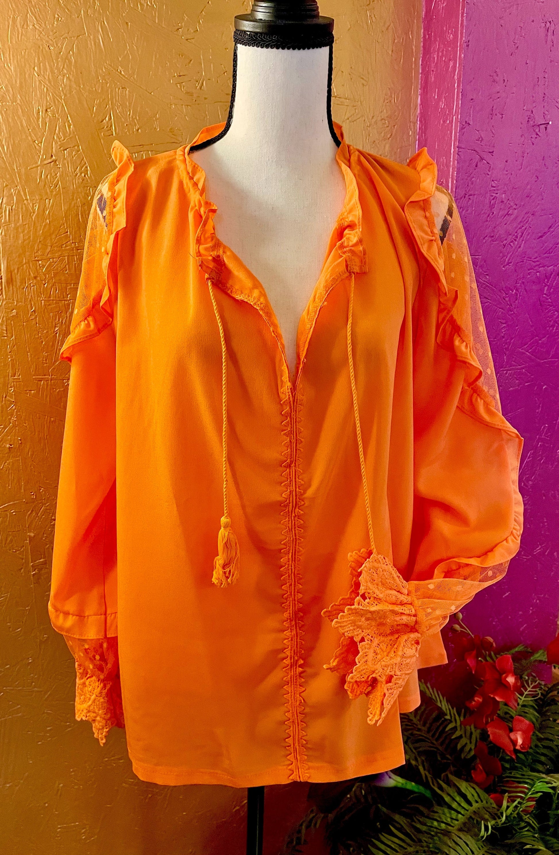 This beautiful blouse features a soft tangerine color, adding a touch of warmth and vibrancy to any outfit. The flouncy ruffles and cap sleeves add a feminine touch, while the long sleeves provide coverage and versatility. Perfect for any occasion, this blouse is a must-have for any stylish wardrobe.